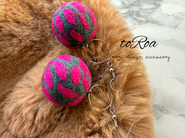 落ち着いたグレーにビビットピンクで柄を描いたデザインアクセサリー デザイン羊毛の大きさ約3センチ 付けた時の長さ約5.5センチ イヤリングや樹脂に変更可能です