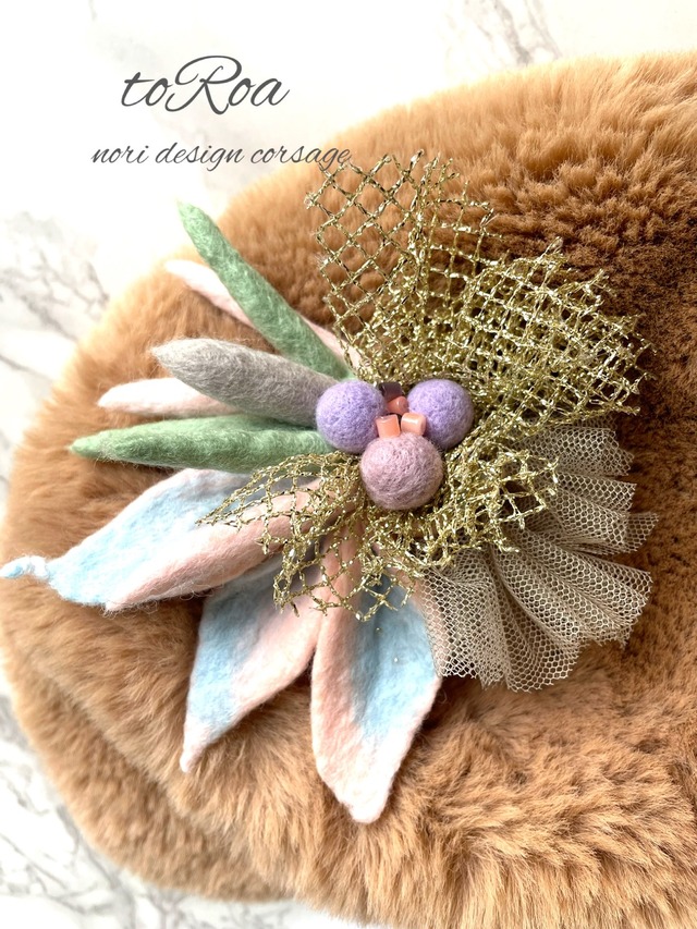 落ち着いた色合いながらも おしゃれなcolorのコサージュ。 羊毛全て手作業で制作し バランスをみて 組み合わせ仕上げました。 ベージュのチュールや 真ん中の羊毛、 ゴールドパーツなどが 他にないコサージュと なっています。 大きさ約10✖️11センチ クリップとピンの2way金具使用