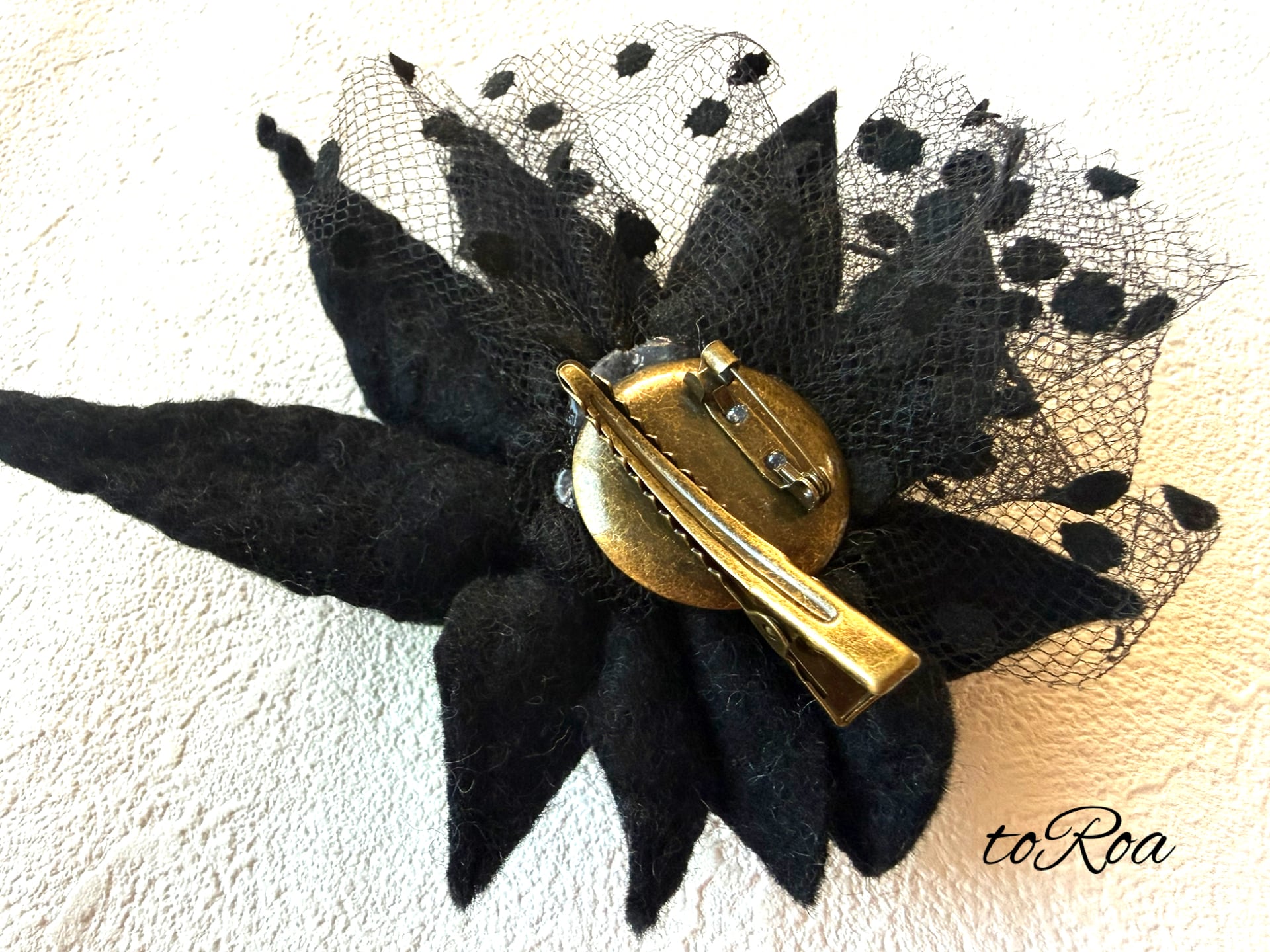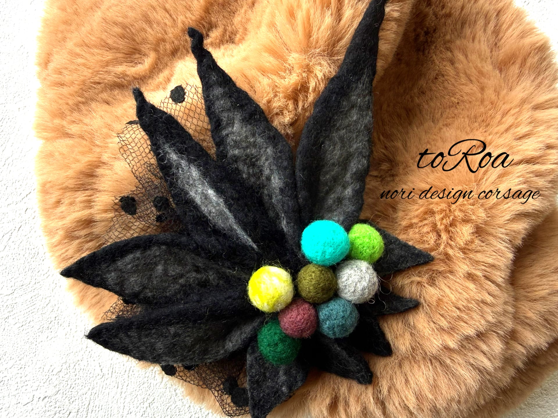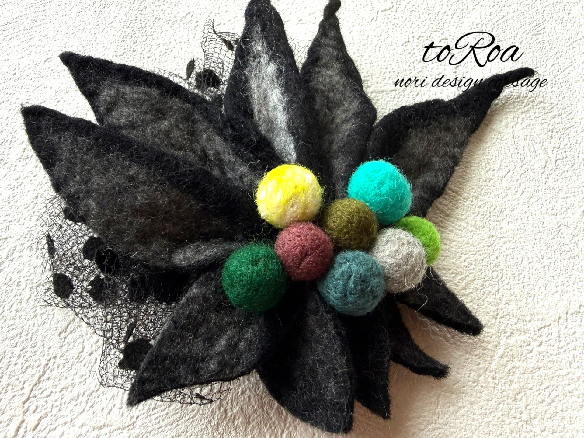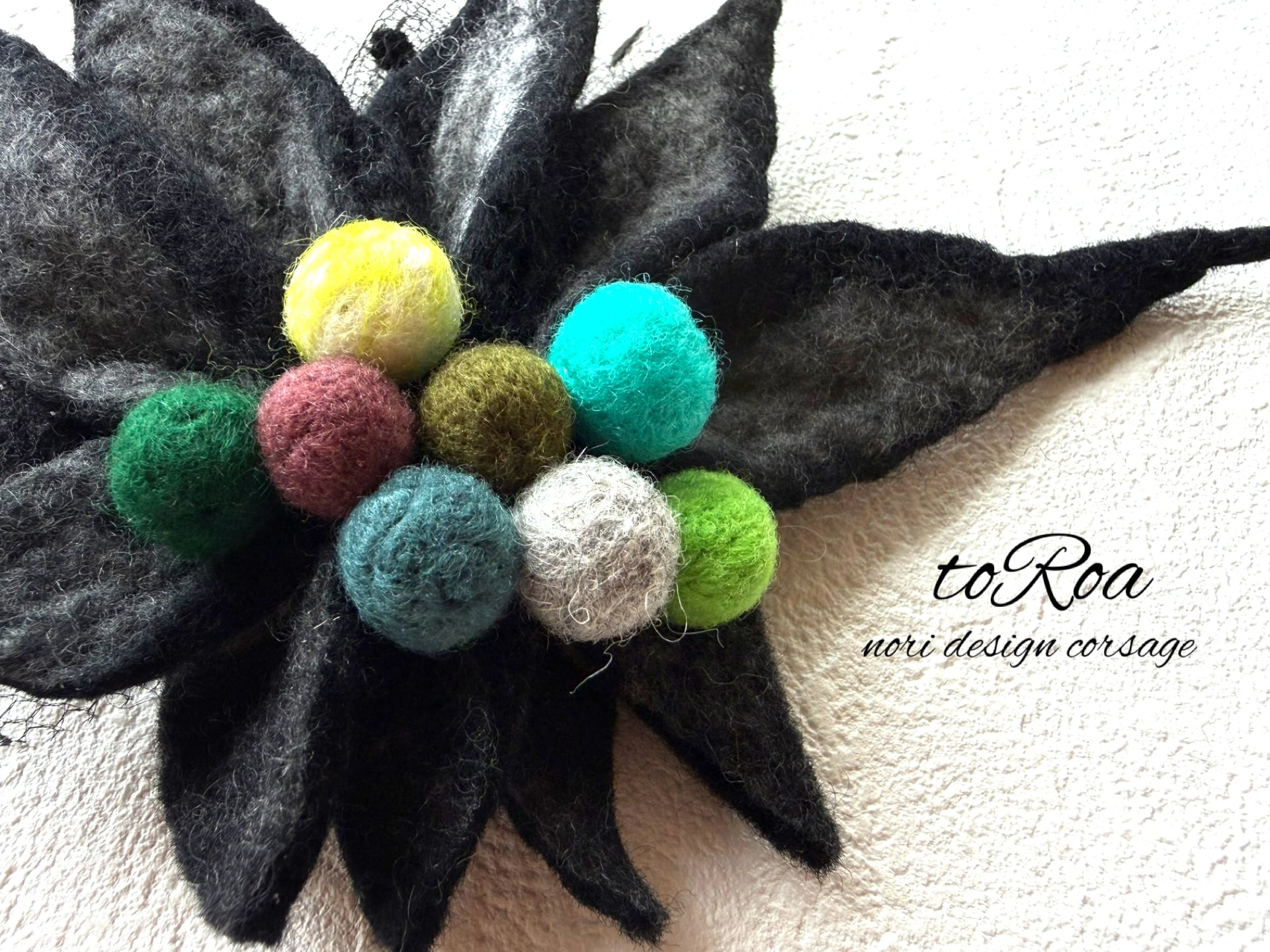 toRoaブラックとカラフル羊毛コサージュ