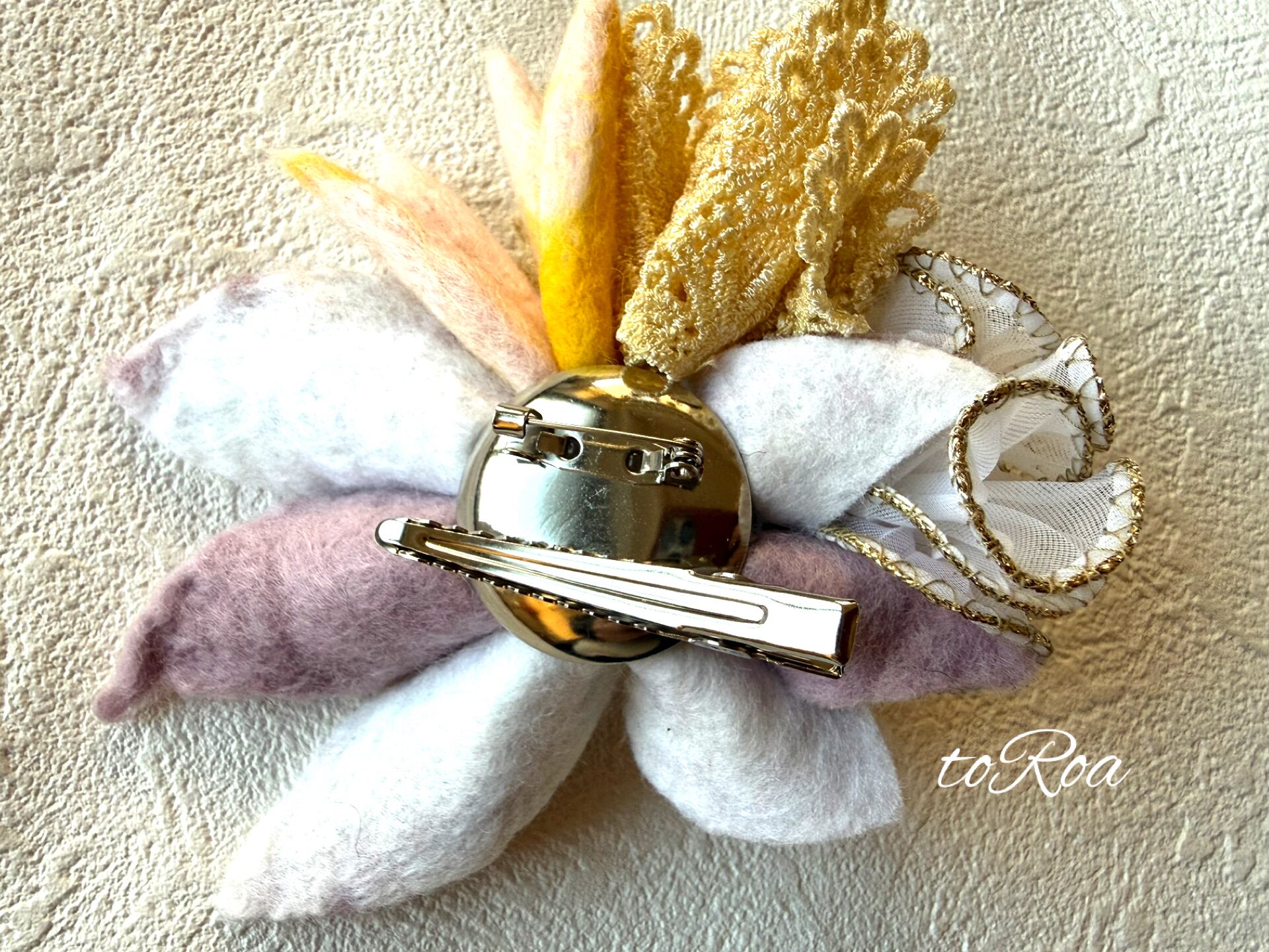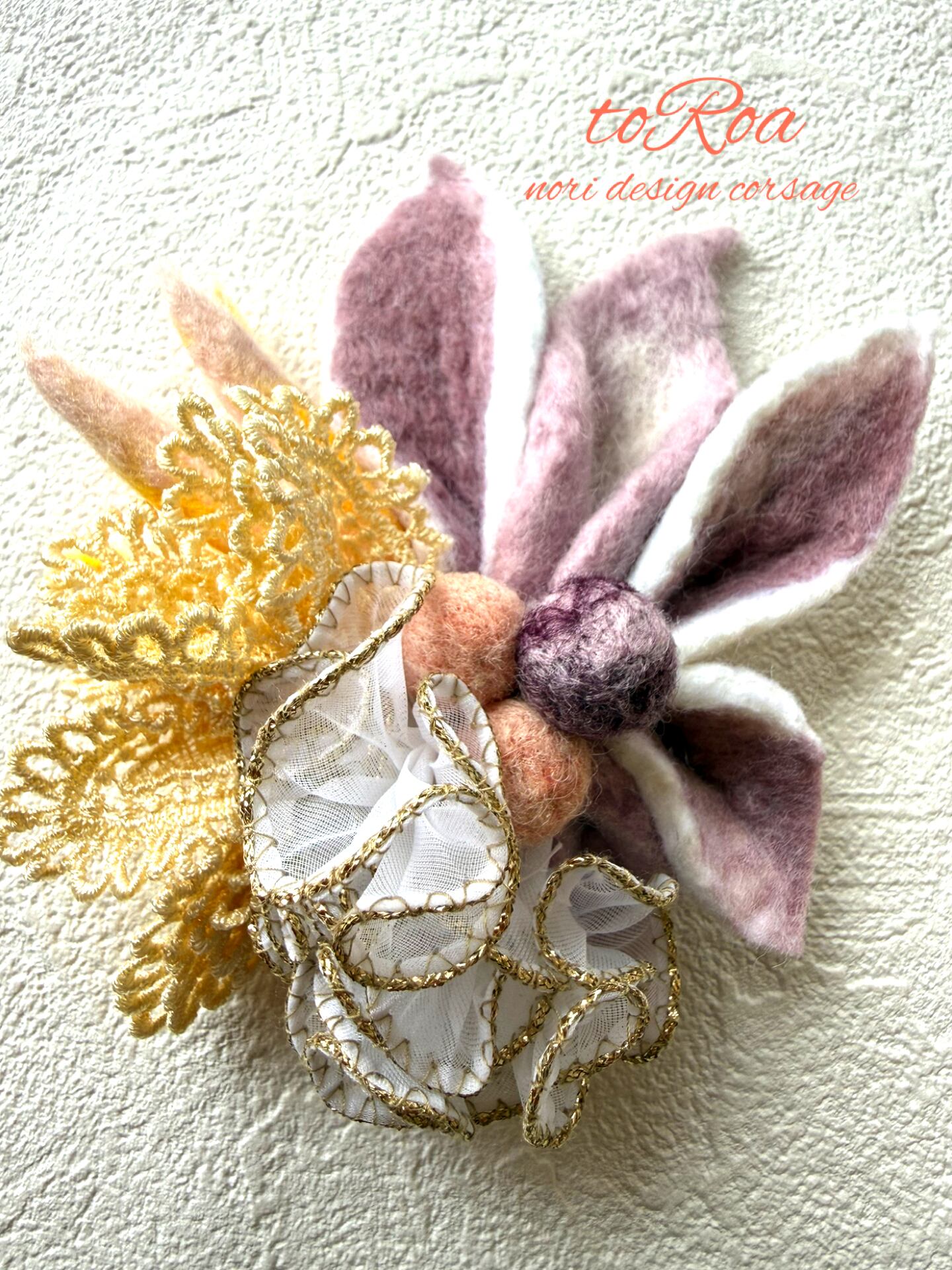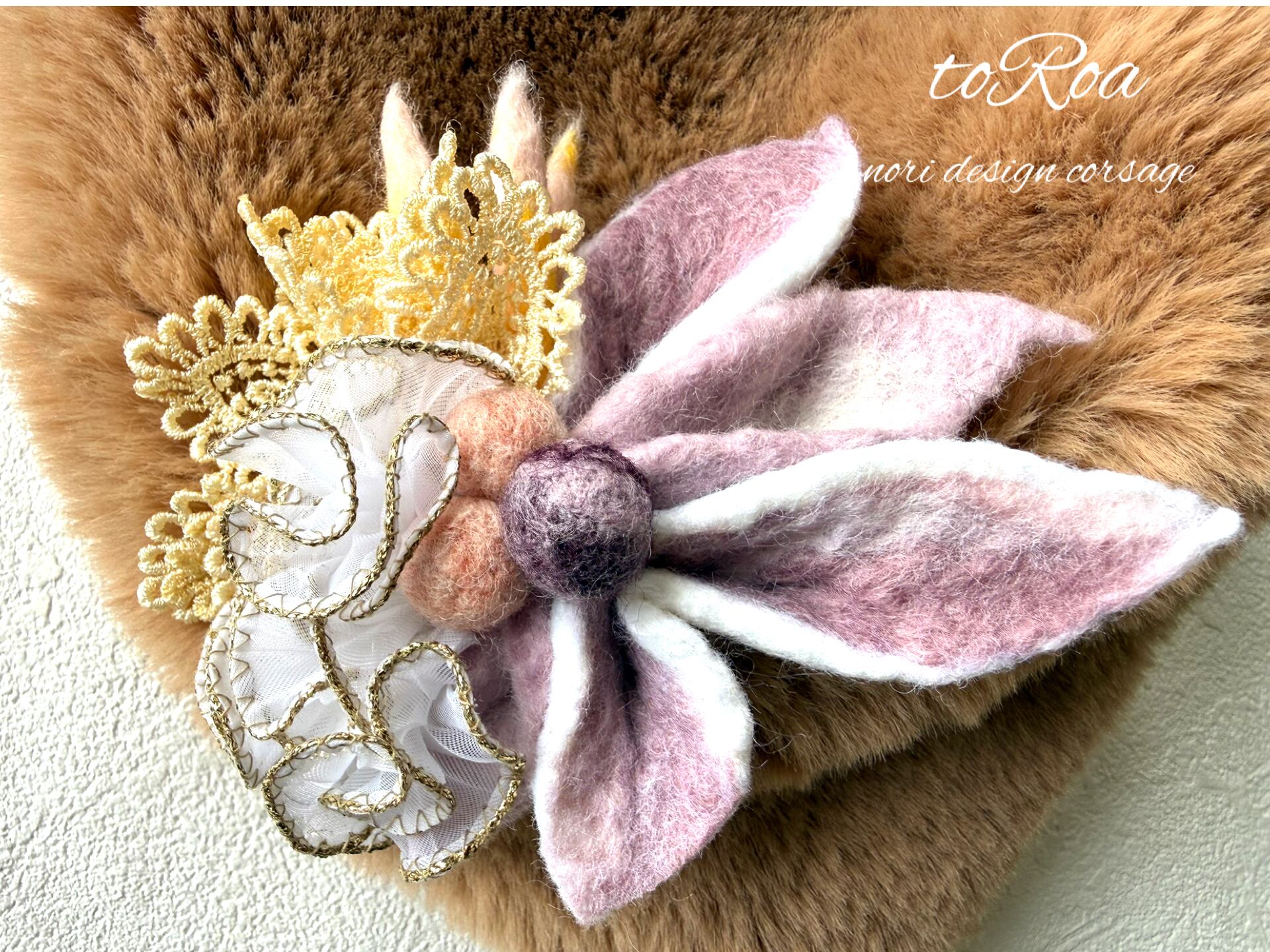 やわらかなピンクの羊毛を使用した、toRoaやわらかピンクコサージュです。柔らかい色合いがフェミニンで華やかさを演出し、どんなシーンにもぴったりです!