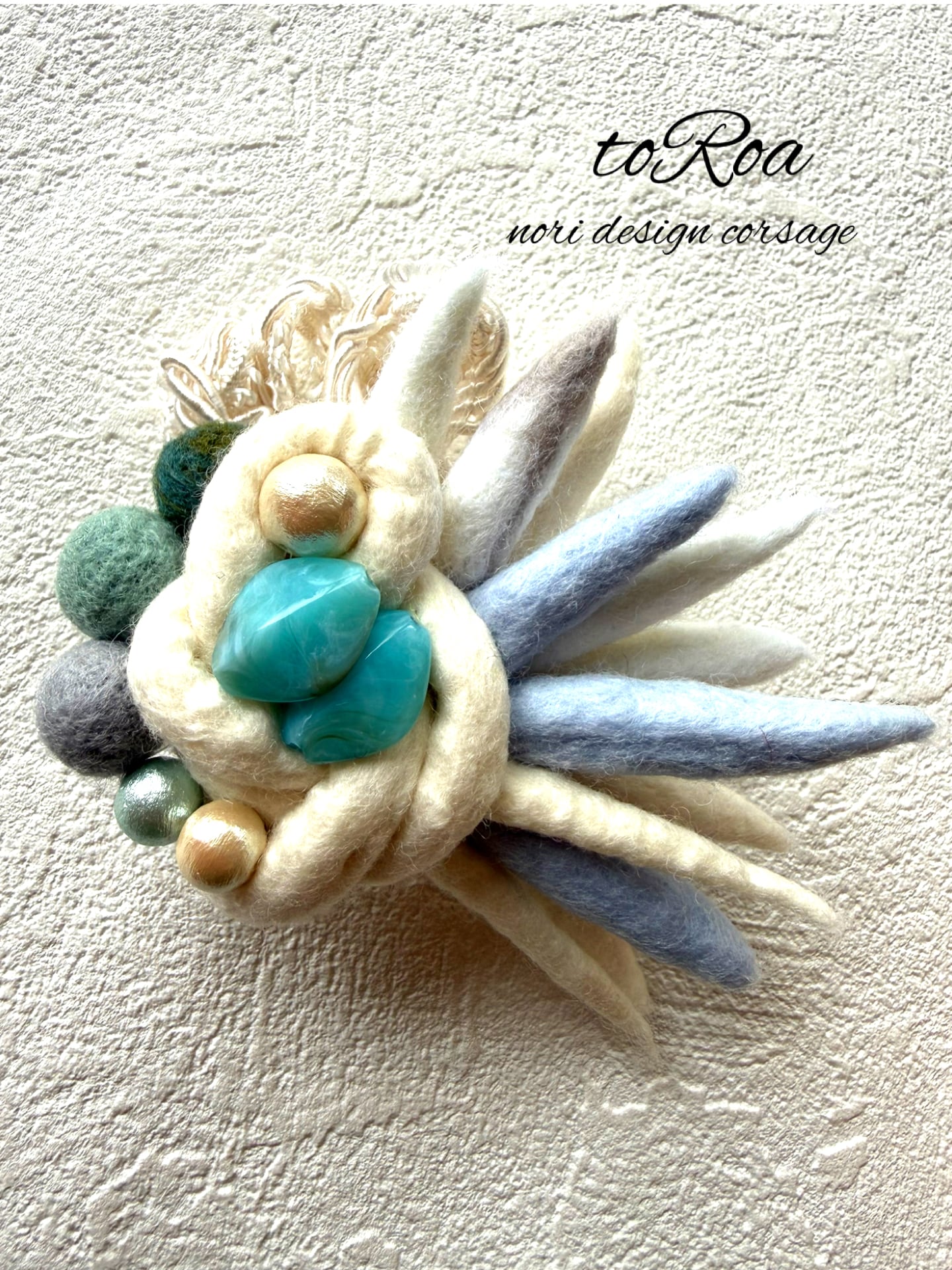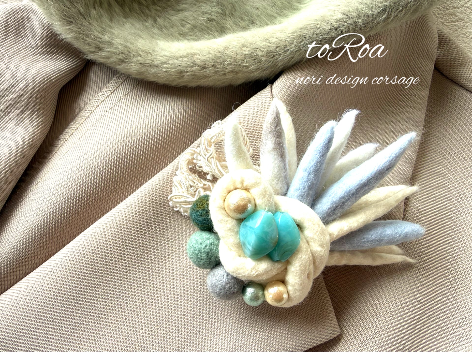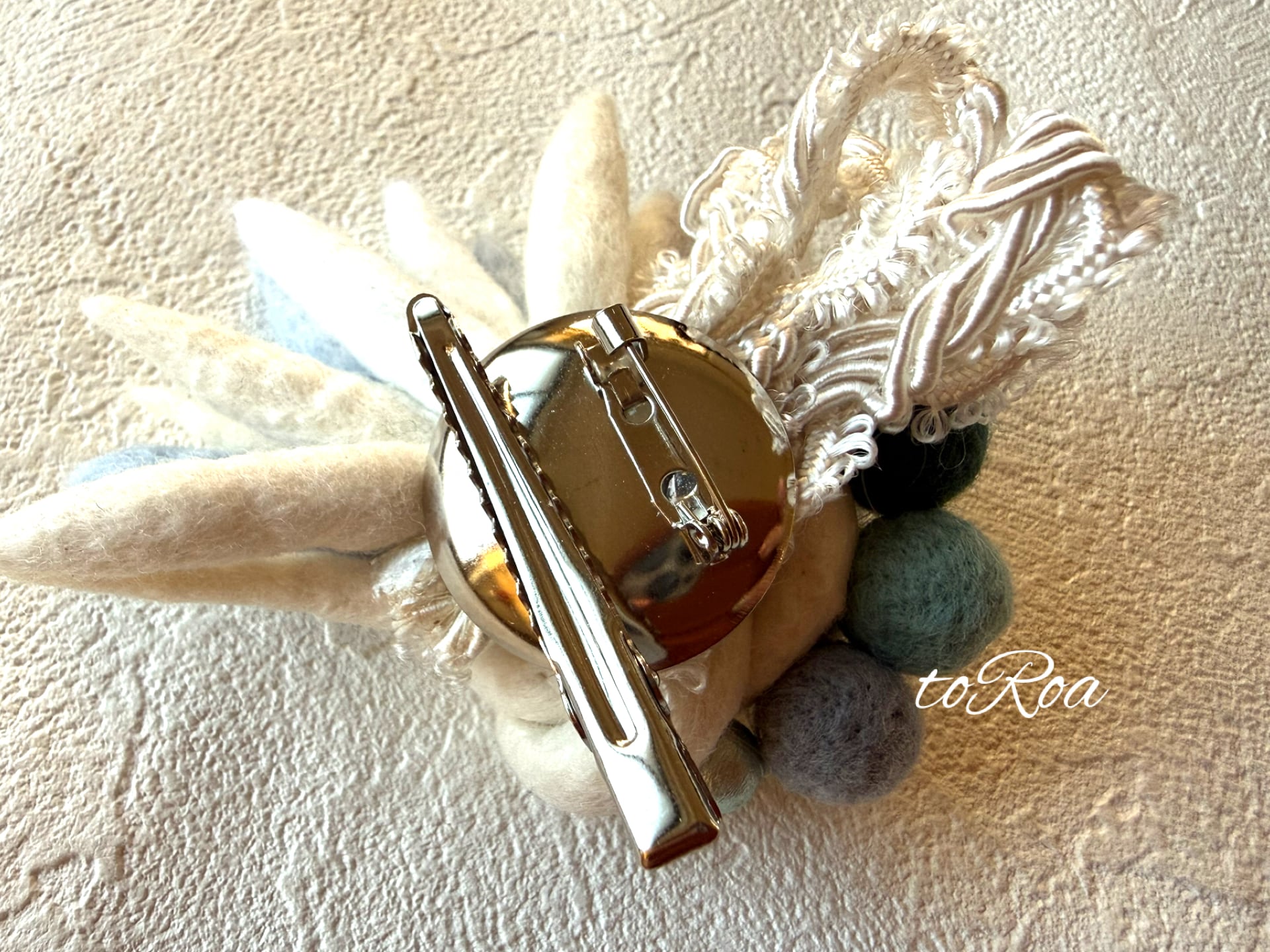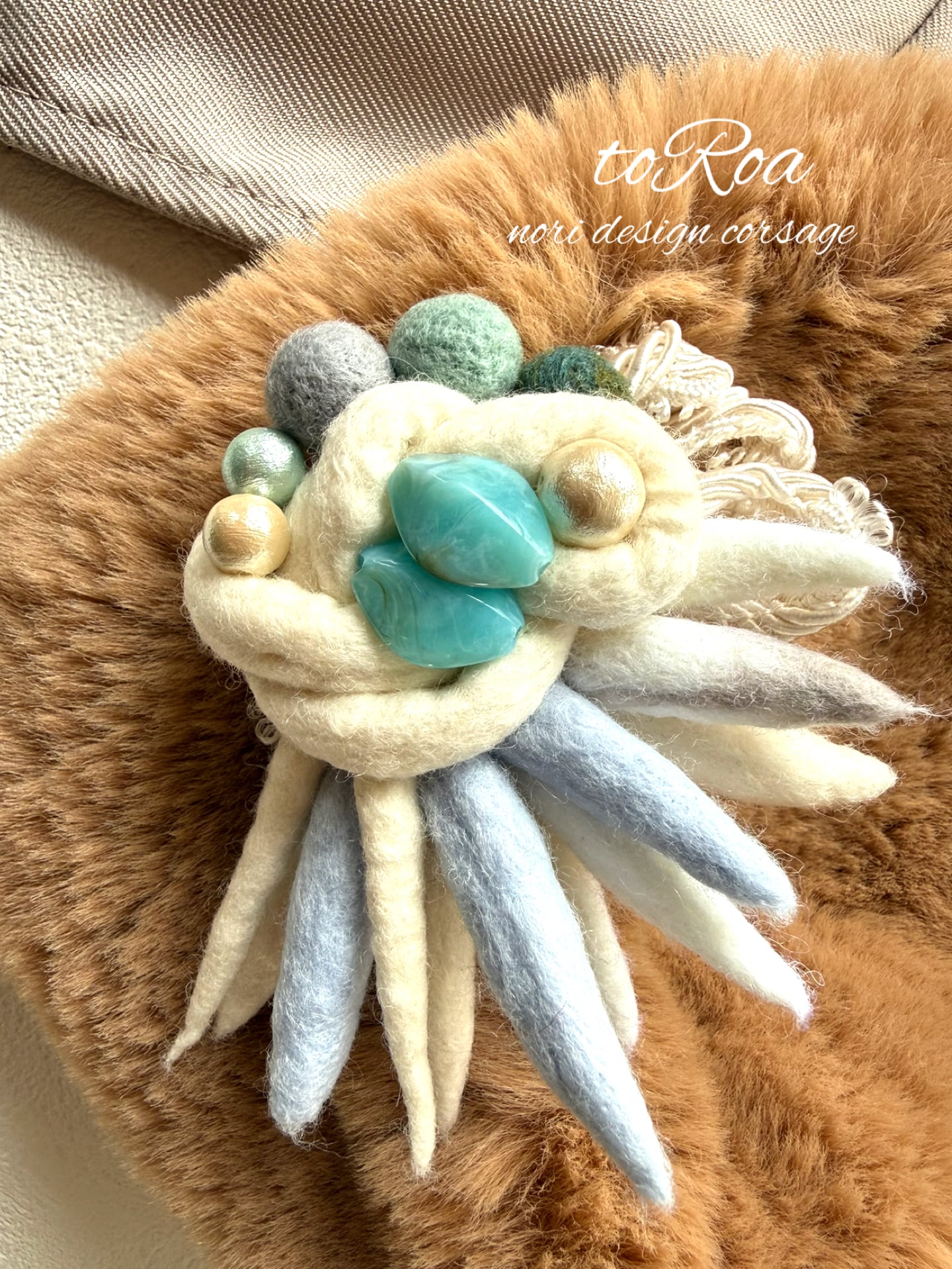 柔らかなライトブルーとホワイトの羊毛を使用したとても美しいコサージュです。さわやかな色合いが上品で、特別なシーンでも存在感を放ちます!