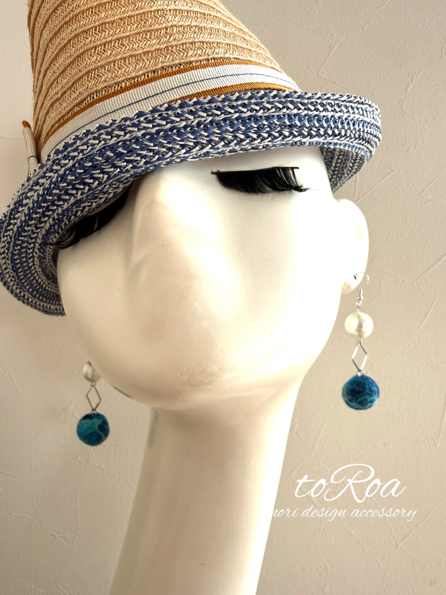 美しい青のマーブル模様と大粒のコットンパールが特徴的なtoRoa Blueマーブルと1.2センチの大粒コットンパール。