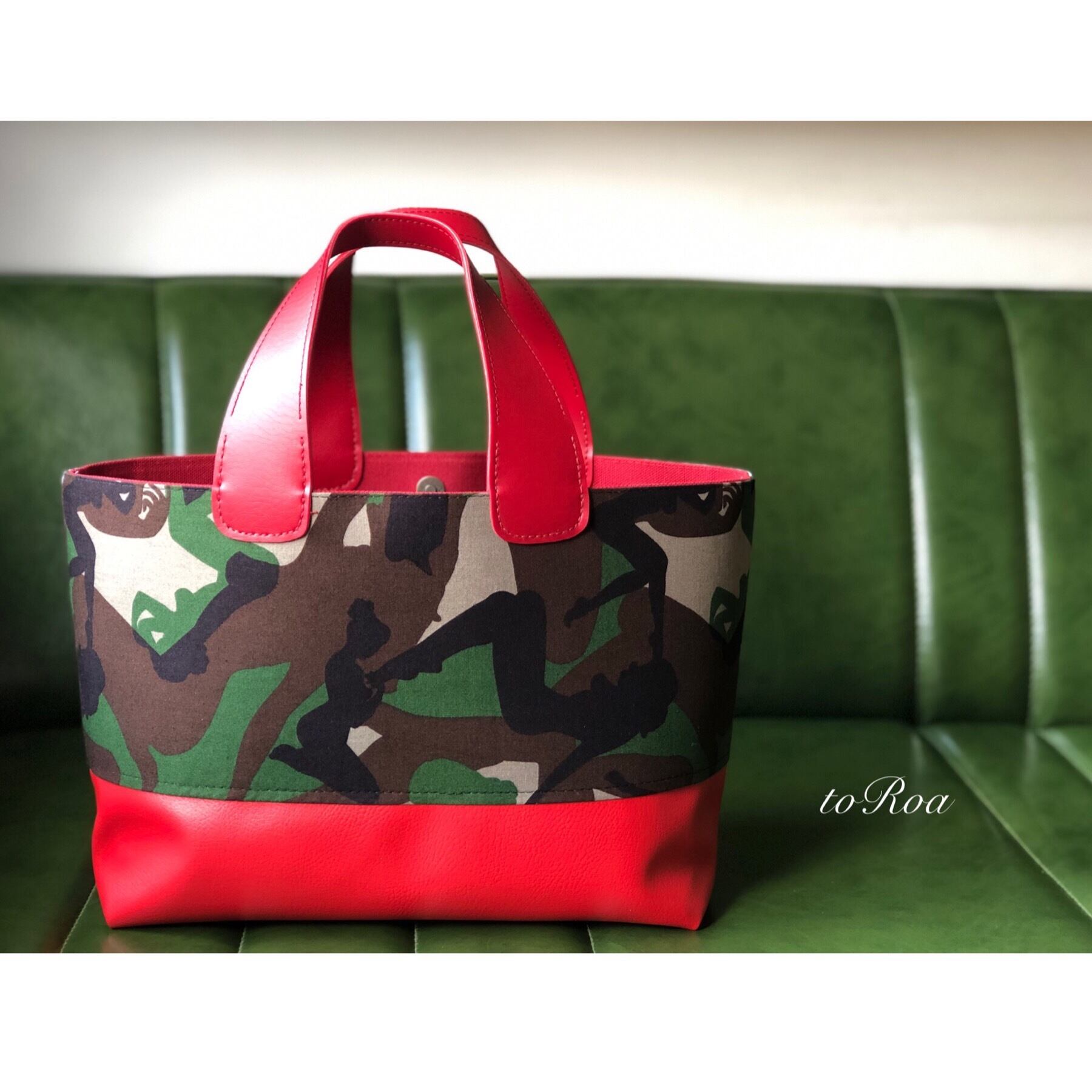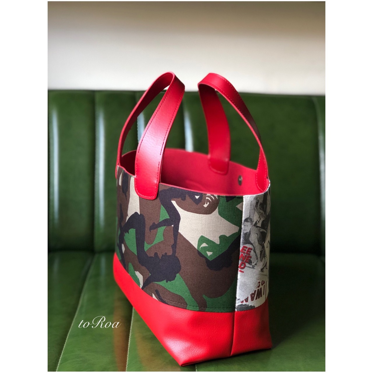 レトロなスター×カモフラ柄違い赤のトートバッグ