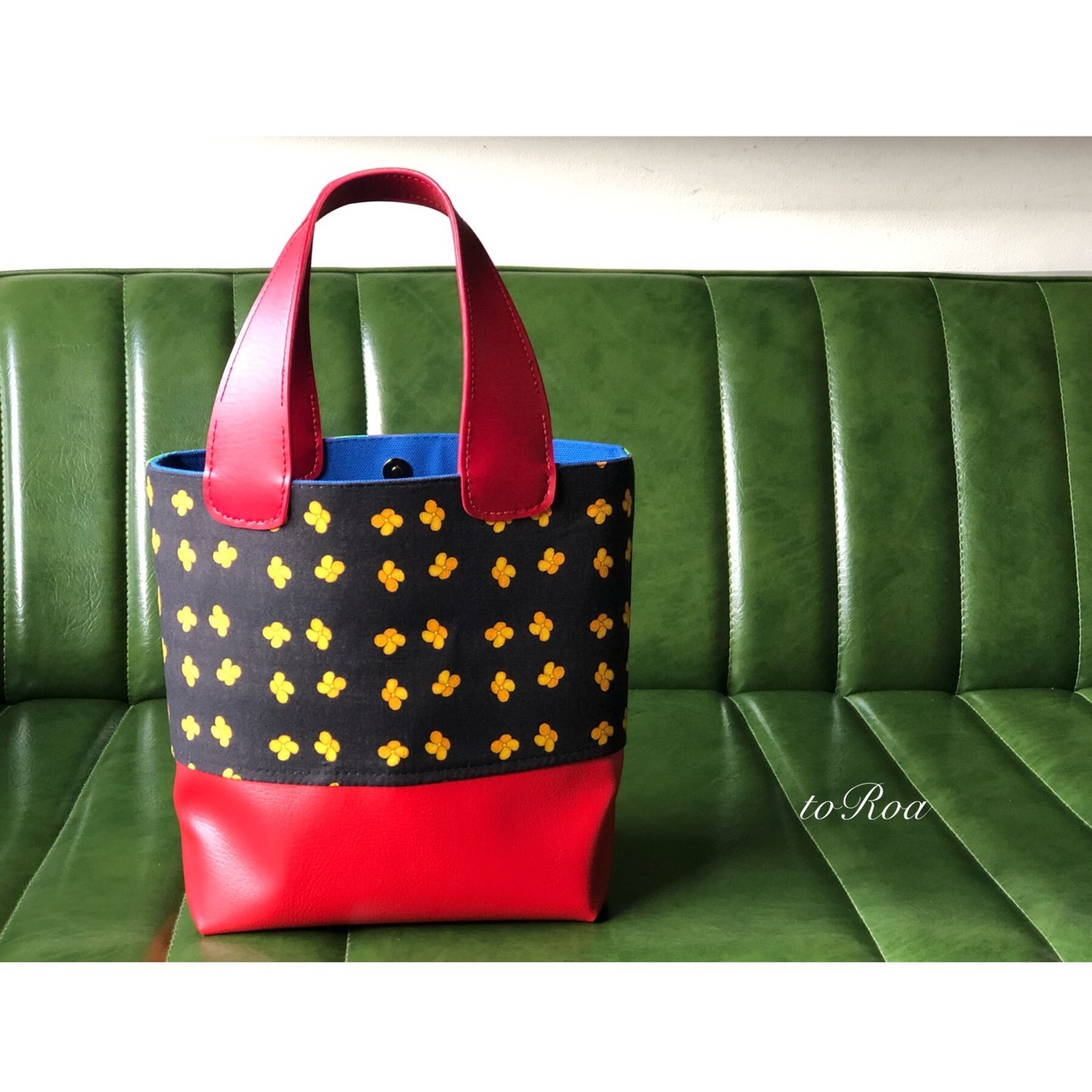 ドカンと大きな個性的な女の子と黒地に小さな黄色の花柄、柄違いのバッグ。