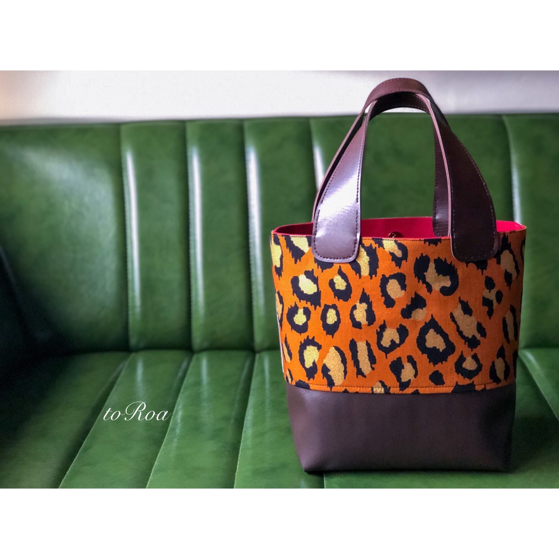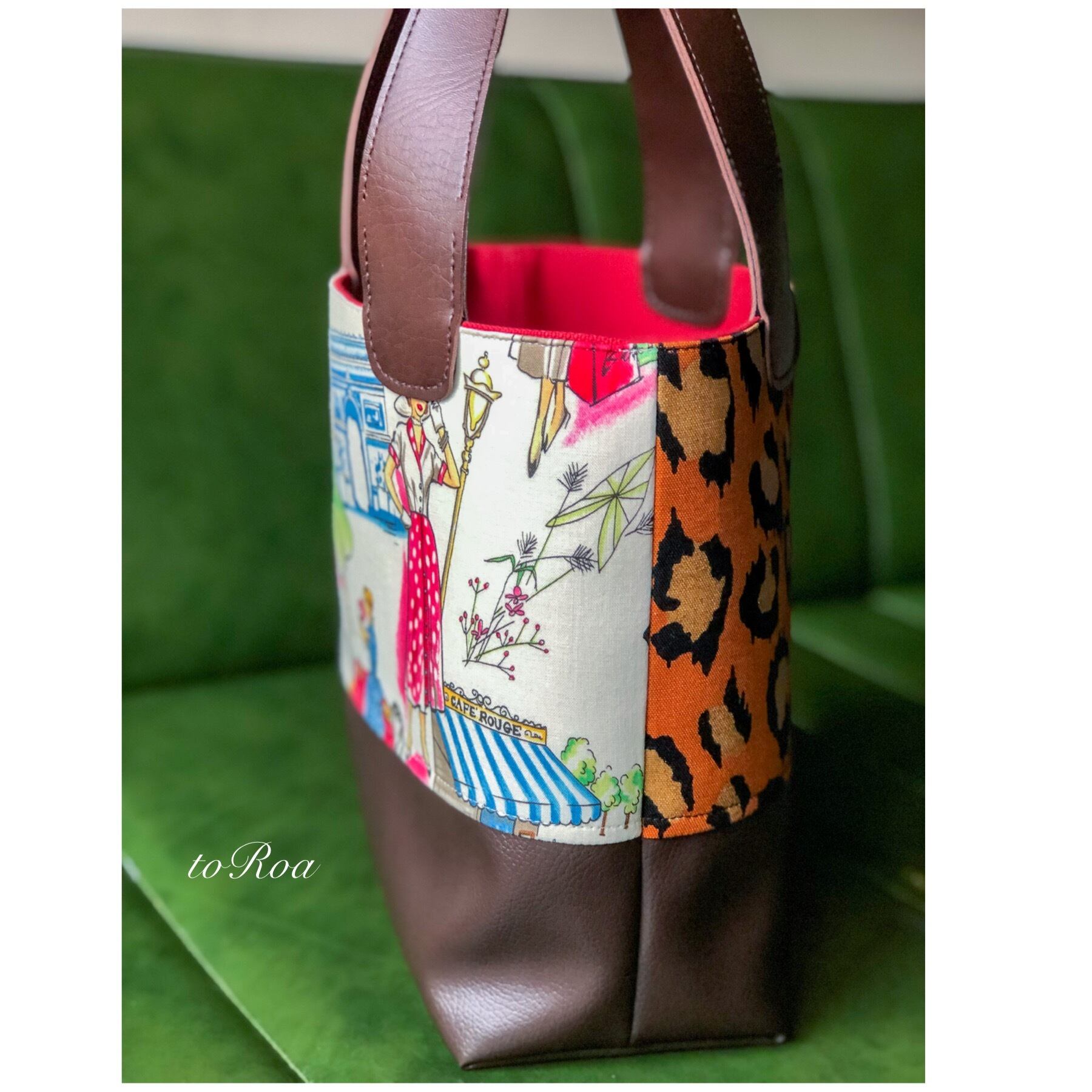 2つの柄をブラウンのレザーでまとめた、柄違いバッグ。
