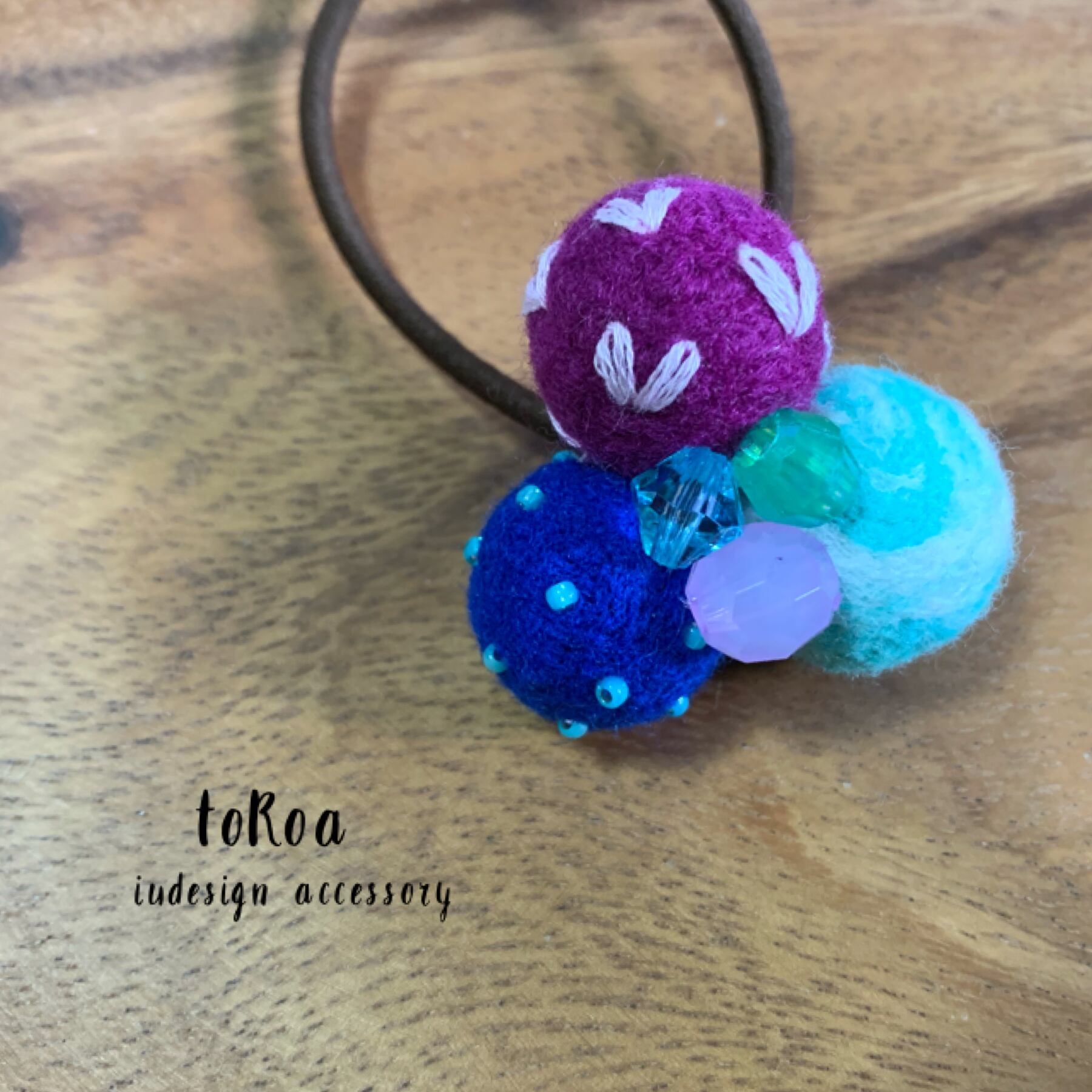 ブルー、エメラルドブルーと白のマーブル、紫ベースにピンクの刺繍糸でハートステッチを施した羊毛ボールの大きめ定番ヘアゴム。