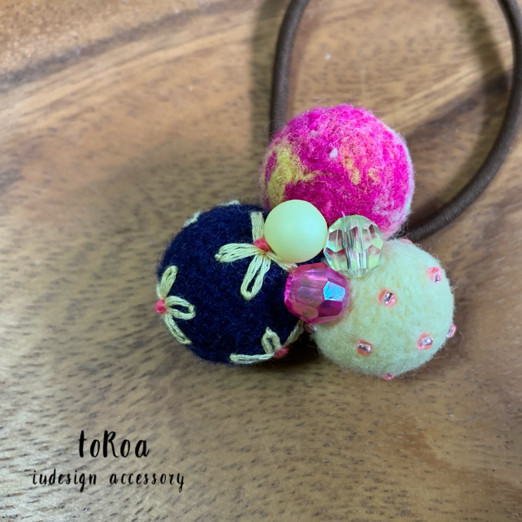 パールイエロー、ビビッドピンクとイエローと白のマーブル、ネイビーベースに黄色の刺繍糸でお花ステッチを施した羊毛ボールの大きめ定番ヘアゴム。