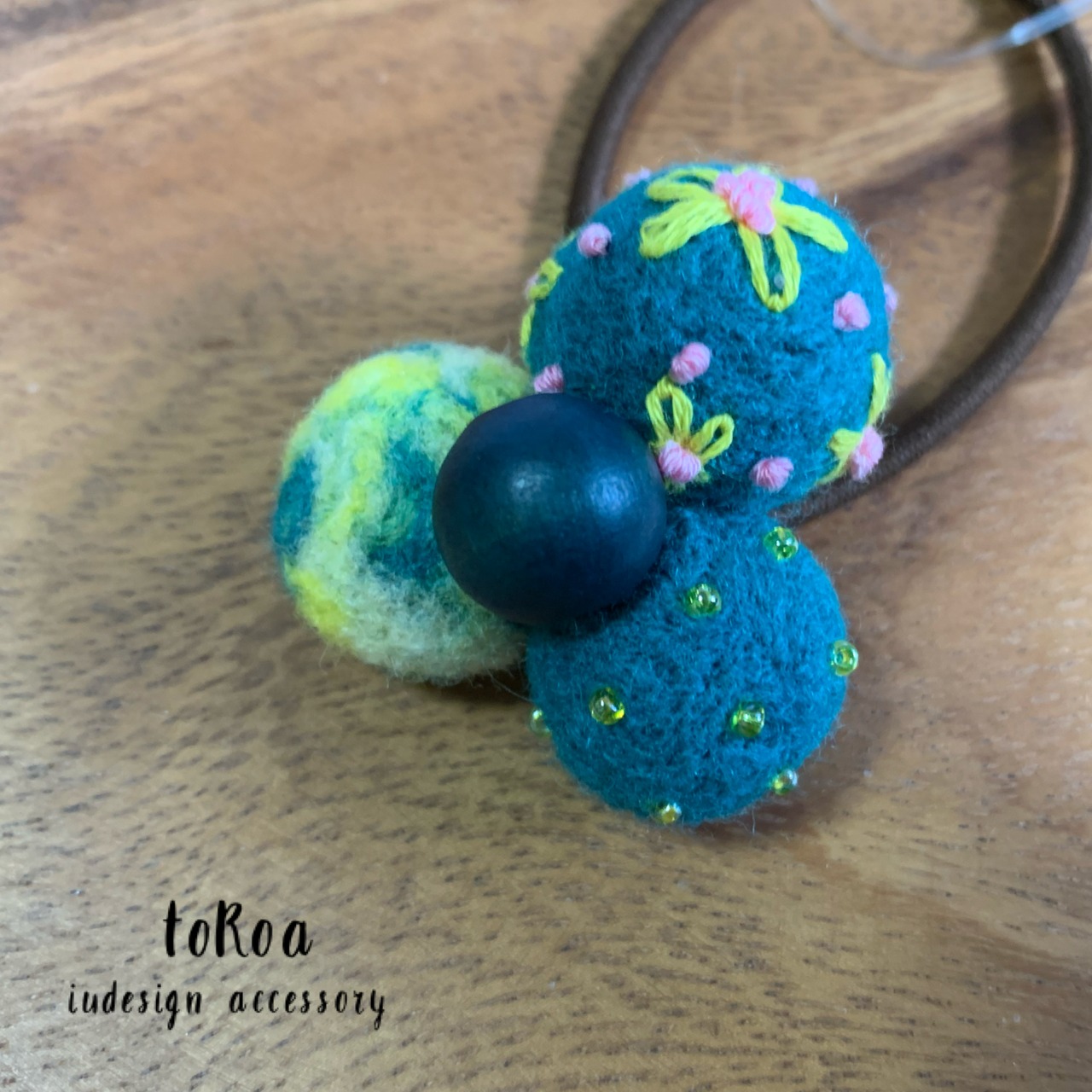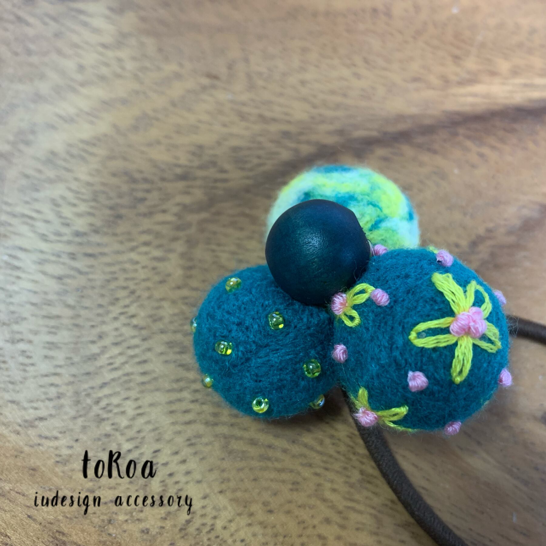 グリーン、グリーンとイエローと白のマーブル、グリーンベースに黄色の刺繍糸でお花ステッチを施した羊毛ボールの大きめ定番ヘアゴム。