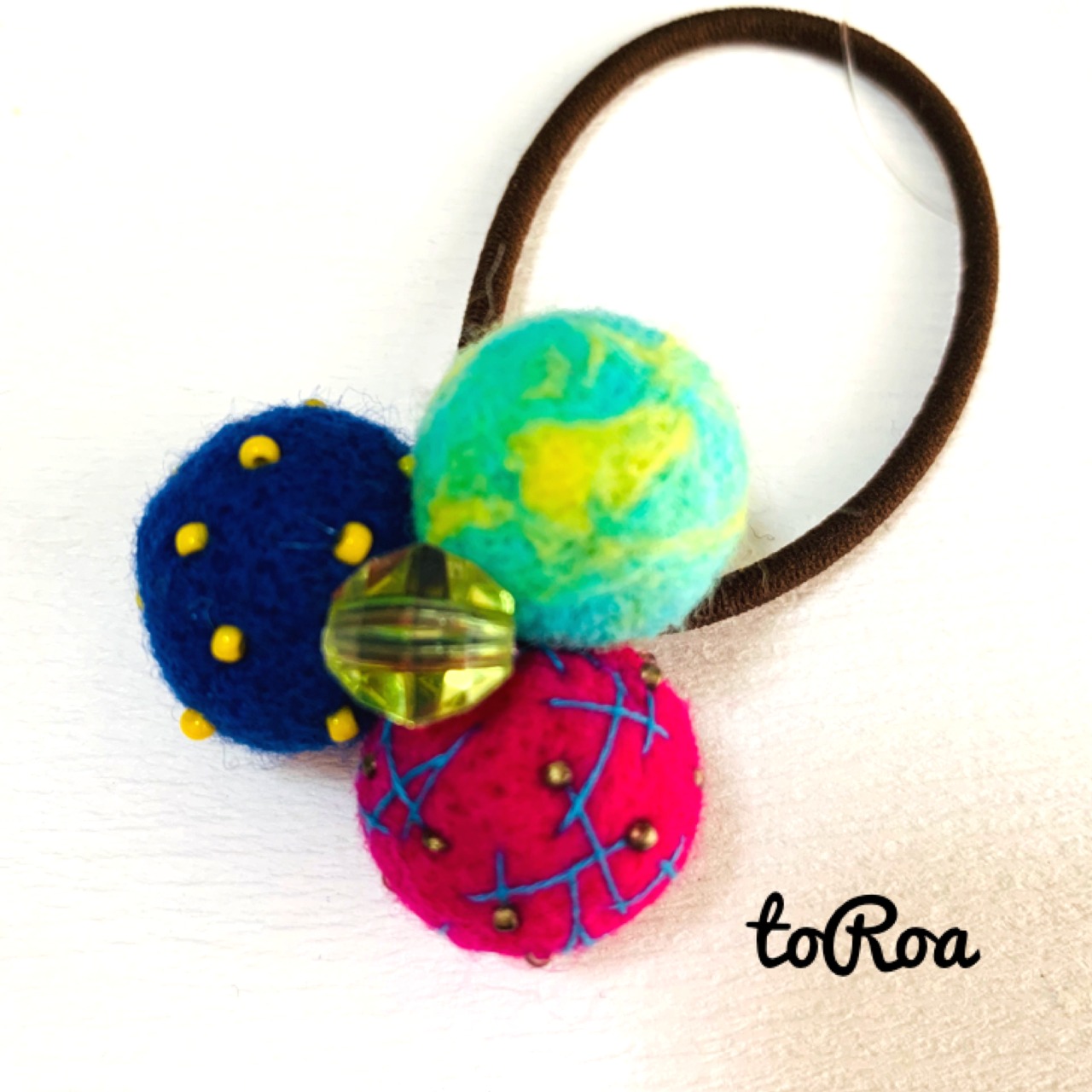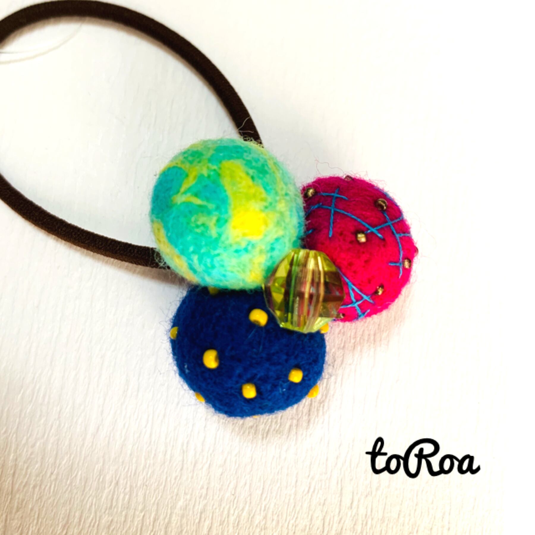 ブルー、ビビッドピンクのエンブロイダリーボール、イエローグリーンマーブルの羊毛ボールを使用。