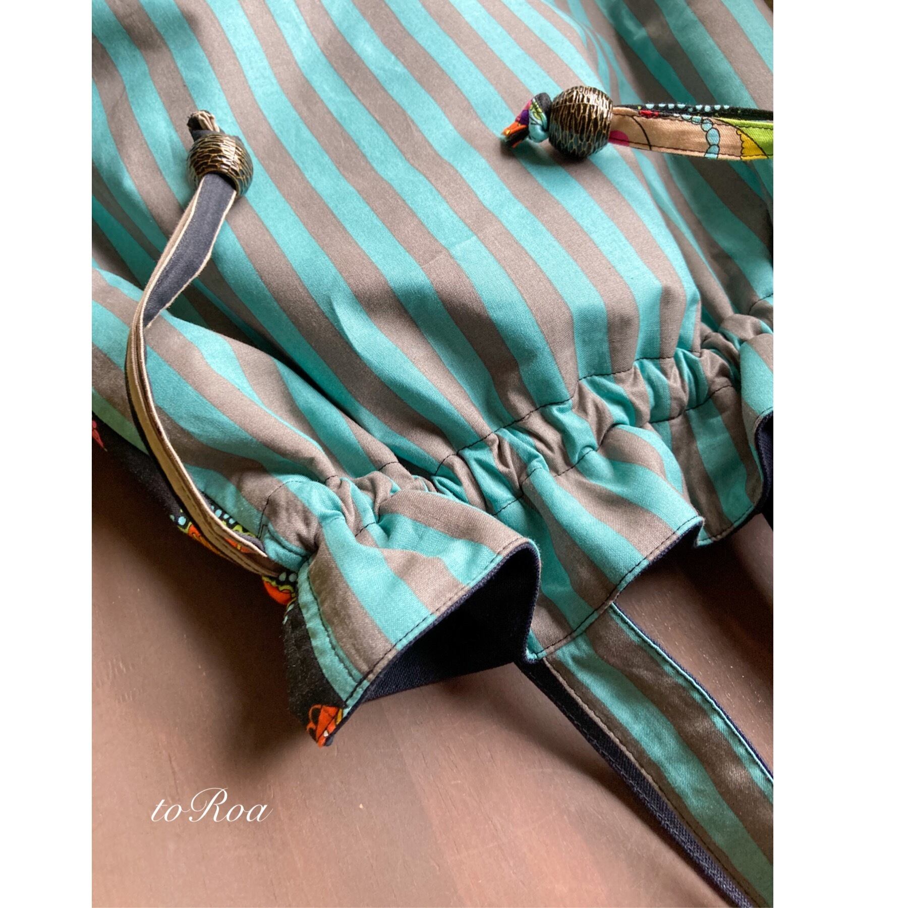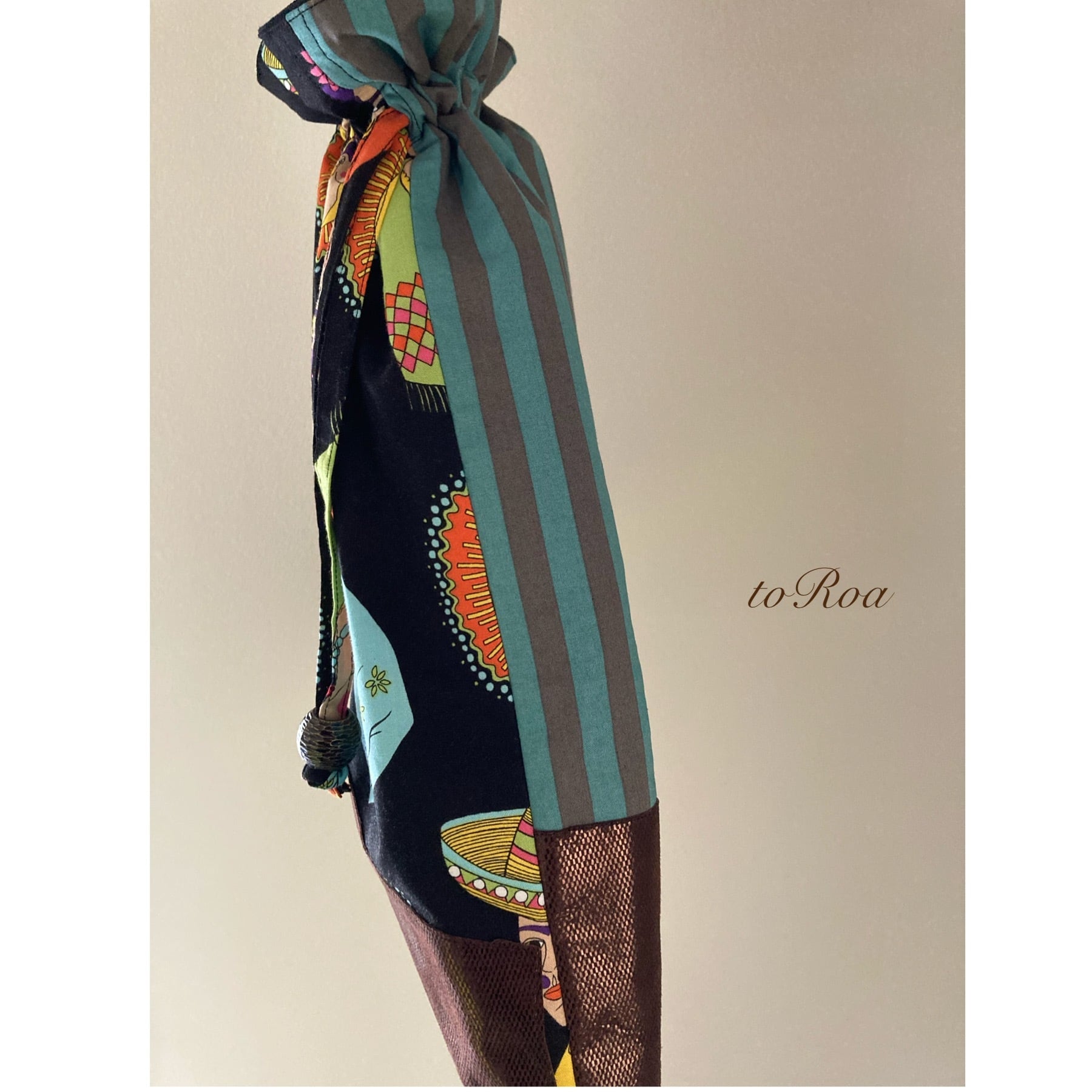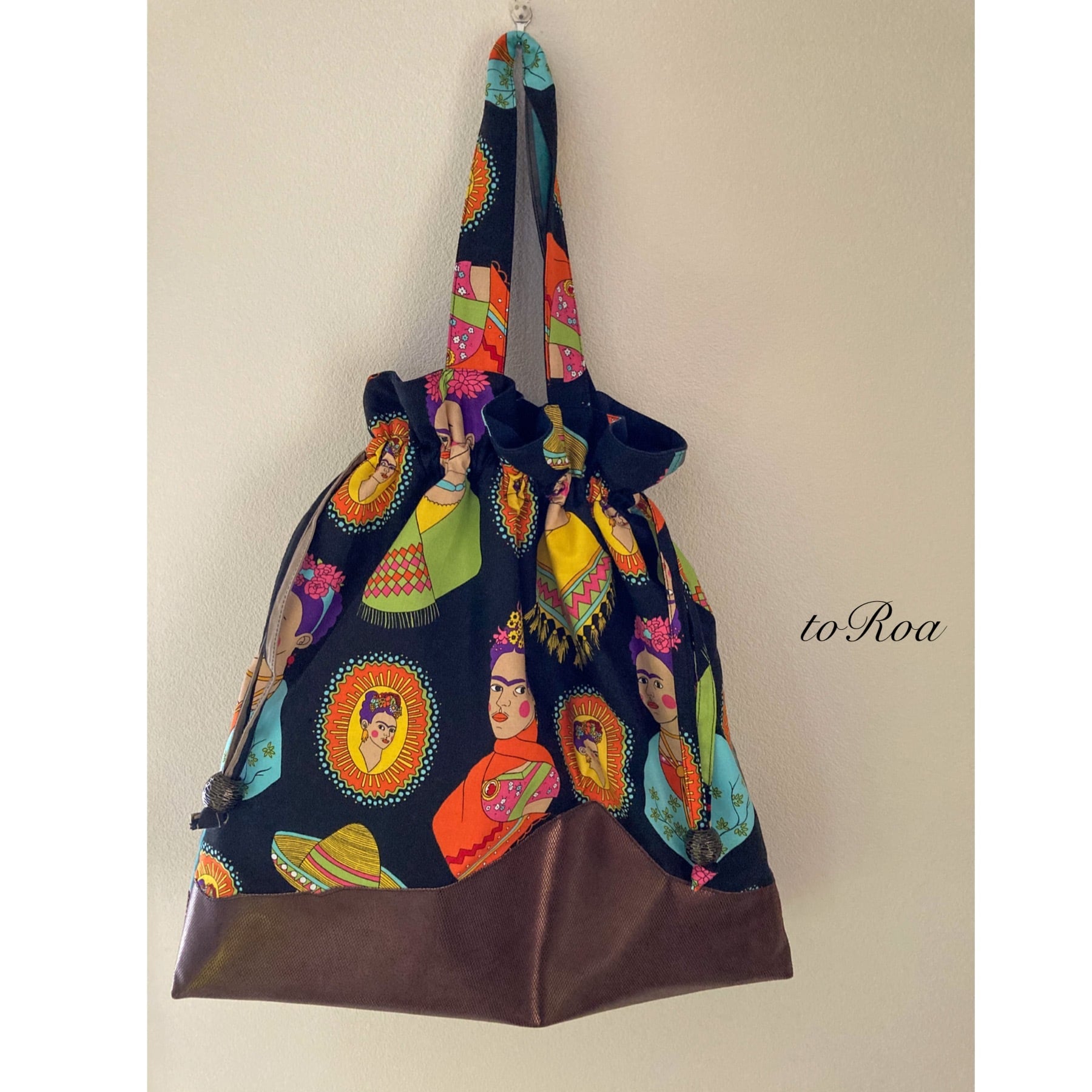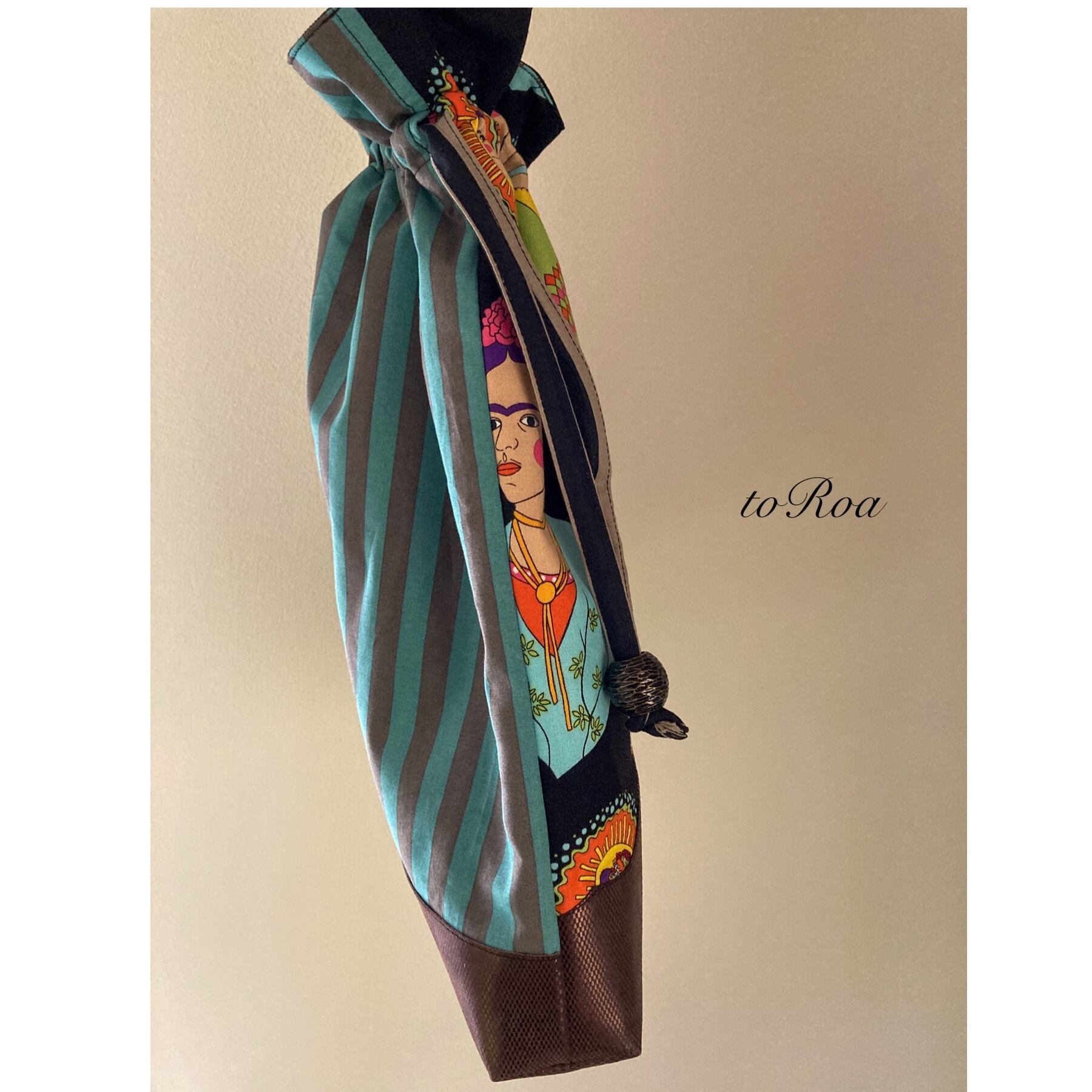 ストライプ× フリーダ・カーロ柄巾着バッグ