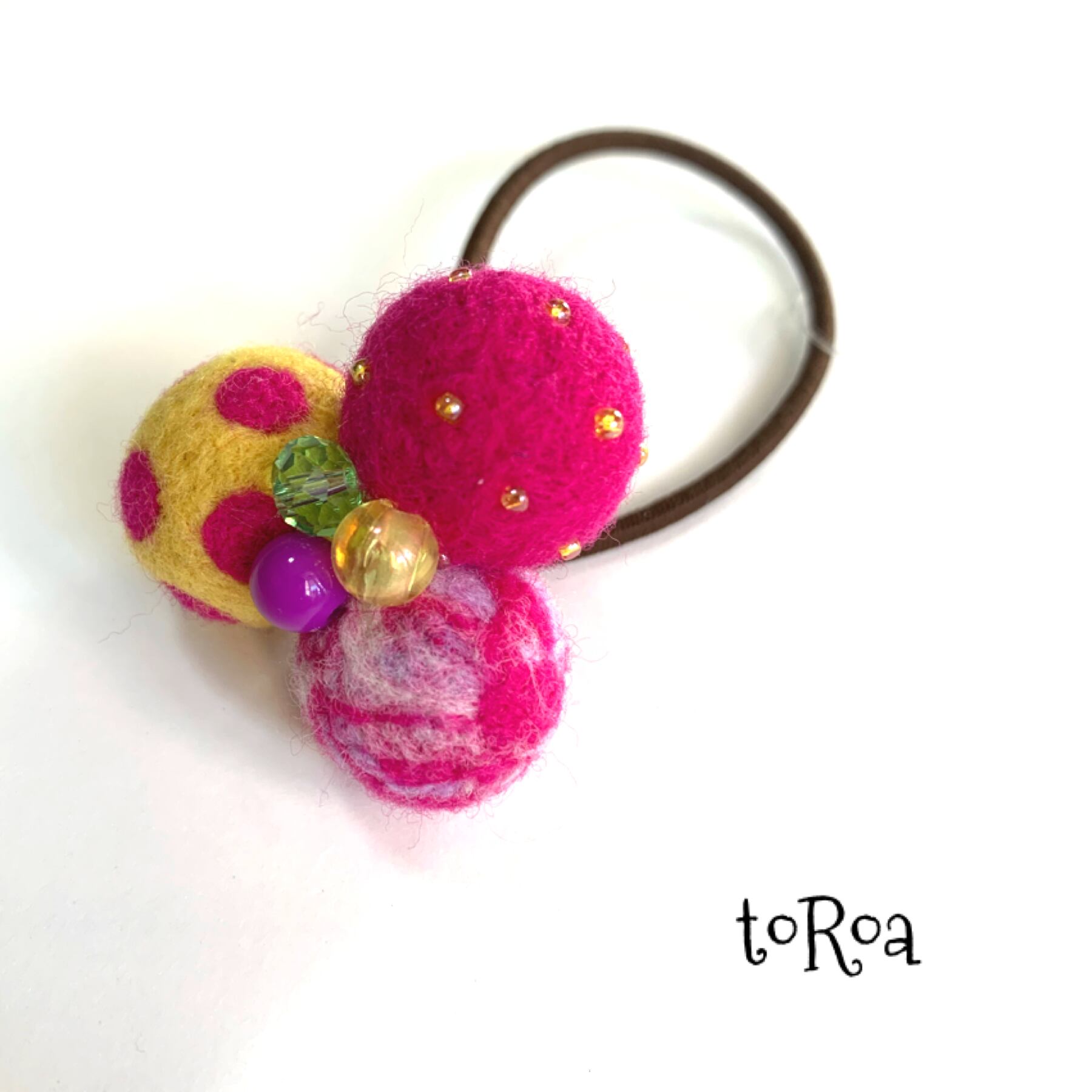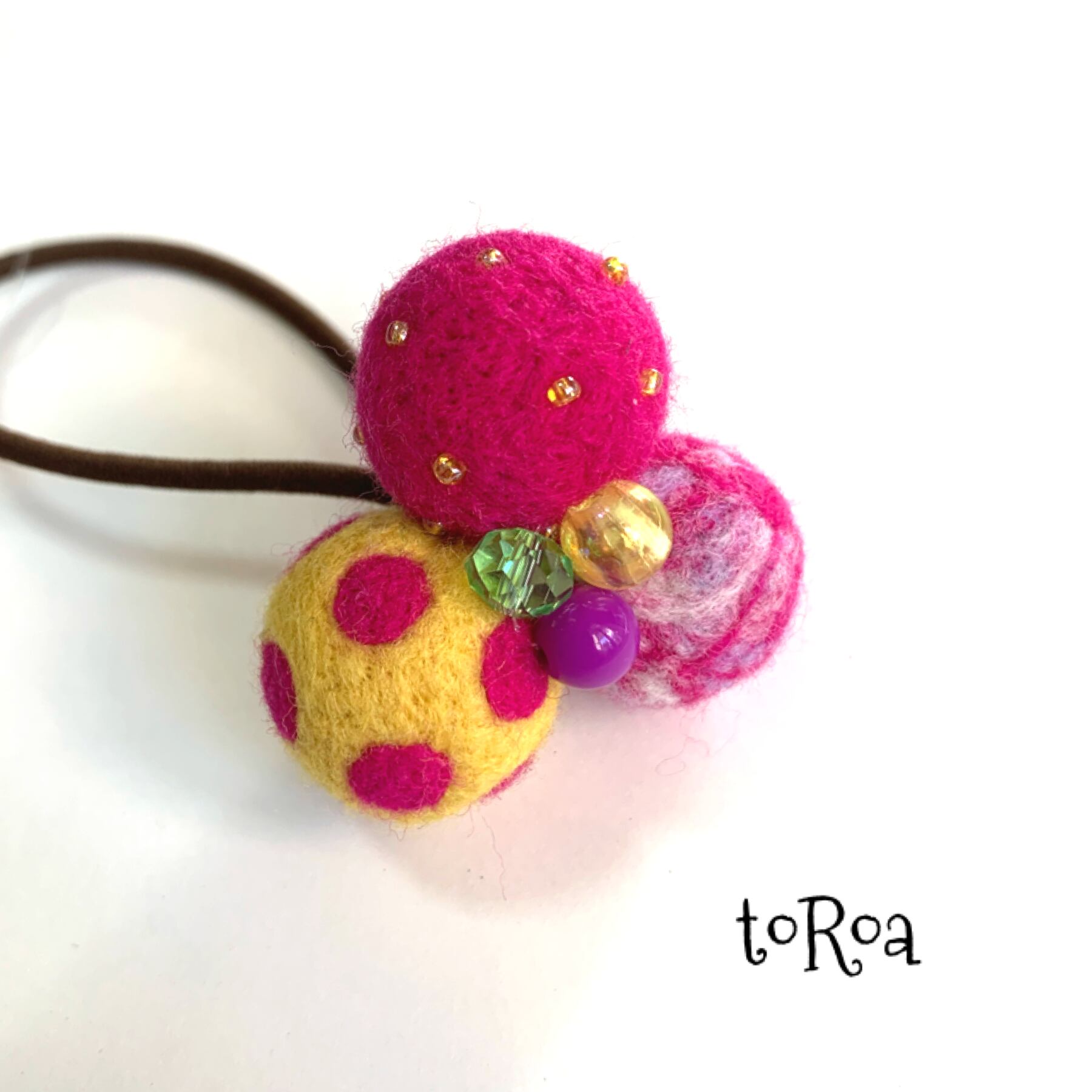 羊毛ボール3個を使ったコロコロかわいいヘアゴムです。