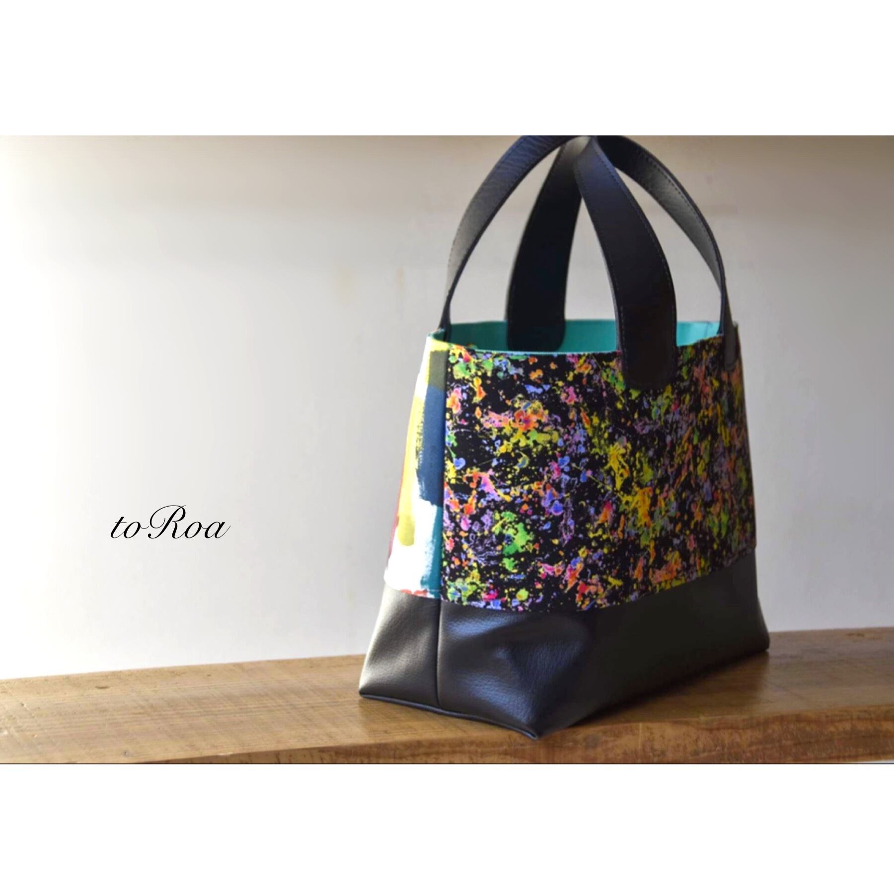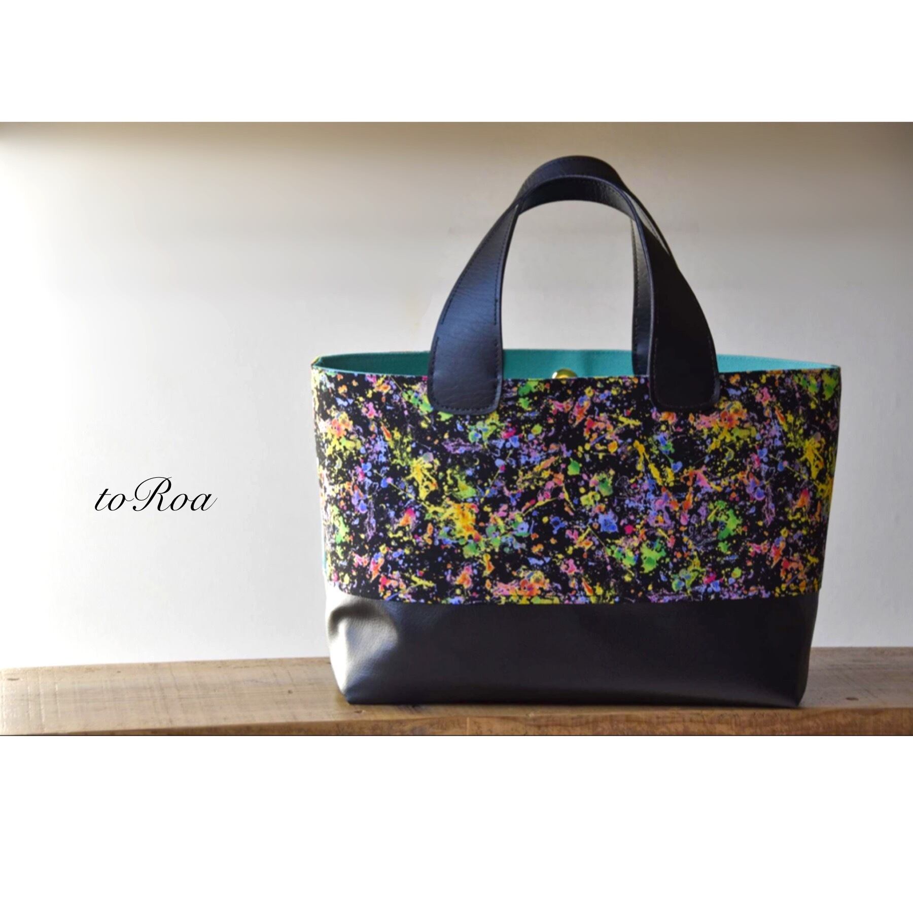 黒にビビッドなペンキを何種類も撒き散らしたような柄。