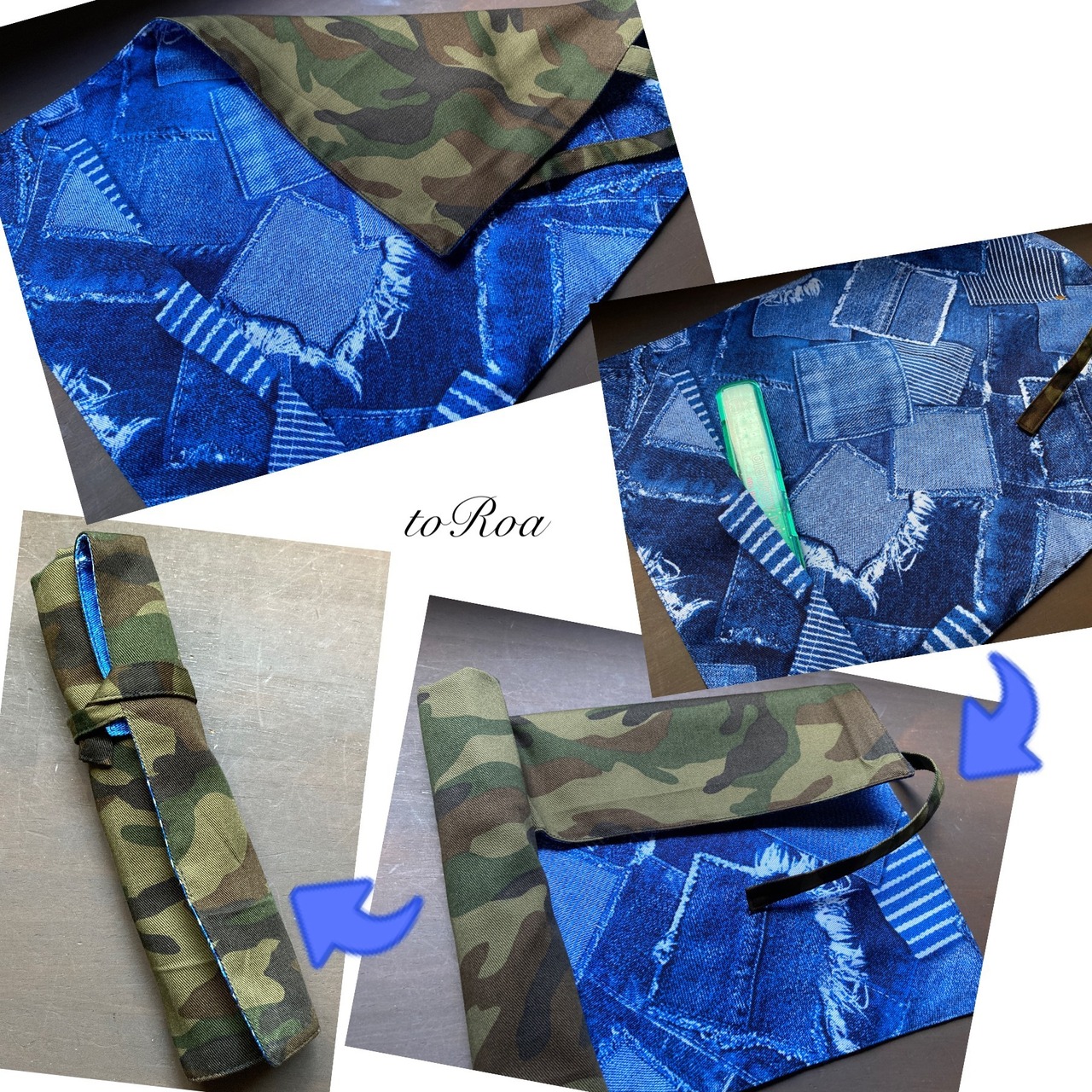 袋部分にお箸を入れてくるくる丸めて紐で縛ればお箸袋にもなり給食袋いらずのリバーシブルナフキン。