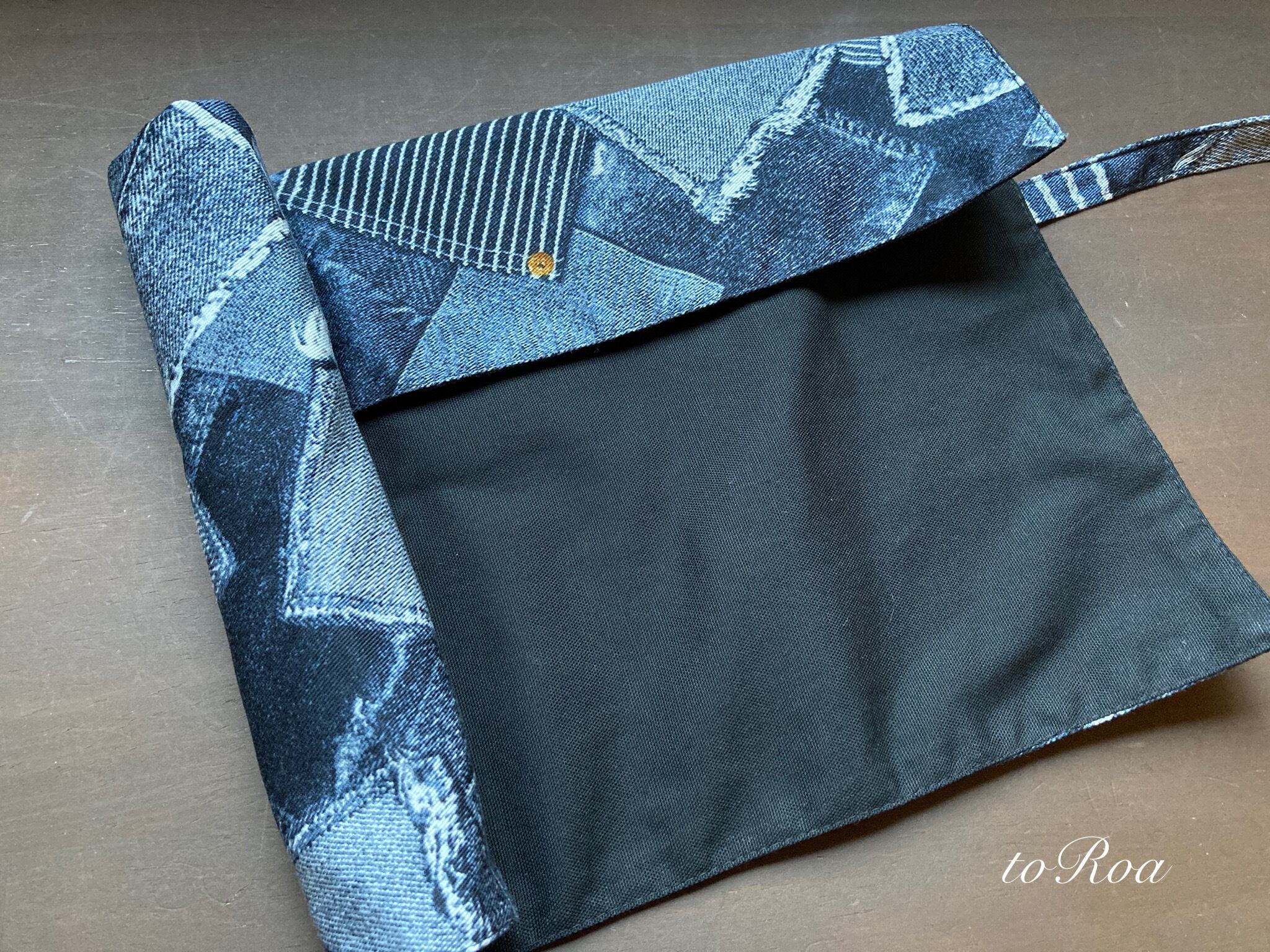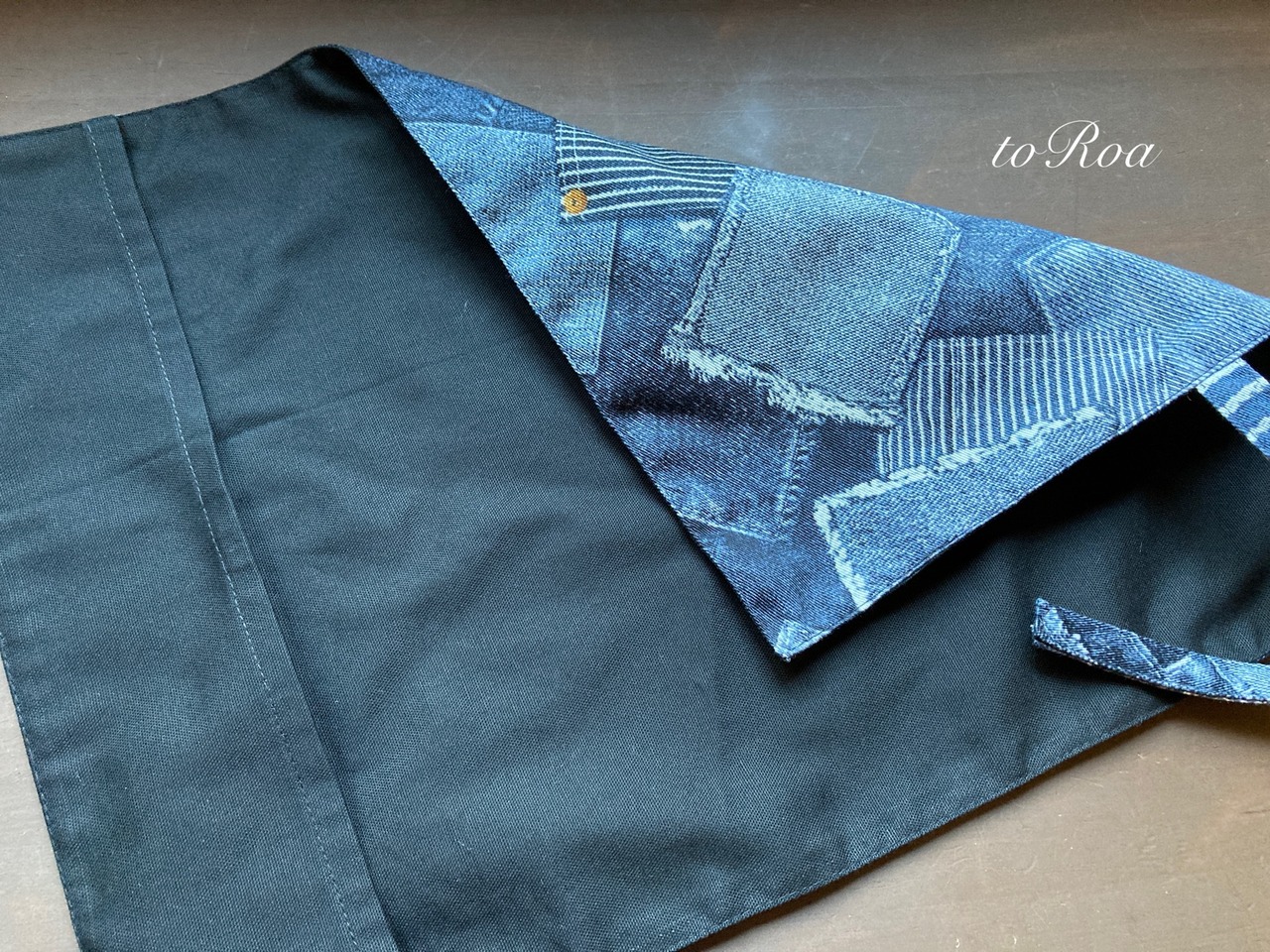 ブルーのデニム風生地に見えますが、カラーは黒っぽいカラーです。